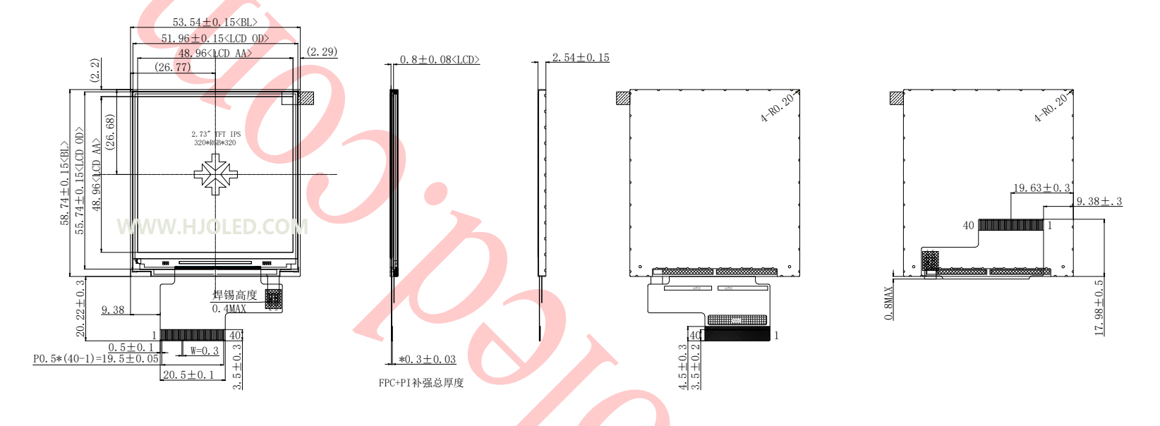 Detta2,73-tums fyrkantig LCD-skärmhar en upplösning på 320x320 pixlar. Den använder mogna, industribeprövade drivrutiner-IC:er – speciellt ILI9488 eller ST7796 – och stöder SPI, MCU och RGB-gränssnitt. Idag är Mr. Huang, ingenjör vid Shenzhen Hongjia Technology, glad över att kunna presentera en av våra flaggskeppsprodukter: HJ2730-03. Denna 2,73-tumsskärm har en standard 40-stiftskontakt, stöder 16-bitars och 18-bitars RGB-gränssnitt och drivs av ILI9488 IC. Den erbjuder hög tillförlitlighet, exceptionella antistatiska egenskaper och är utrustad med en 6-LED-bakgrundsbelysning som avger ett rent vitt ljus.